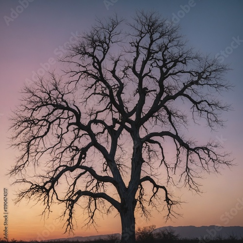 © Tariq, Fototapeta premium An artistic silhouette of a bare white tree against a pastel sunset.