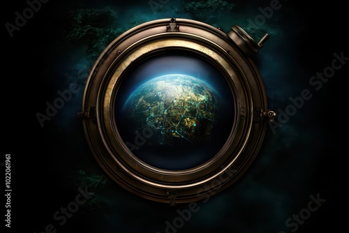 Fototapeta premium An artistic view of Earth through a porthole, merging the beauty of space and science in vibrant colors and intricate details.