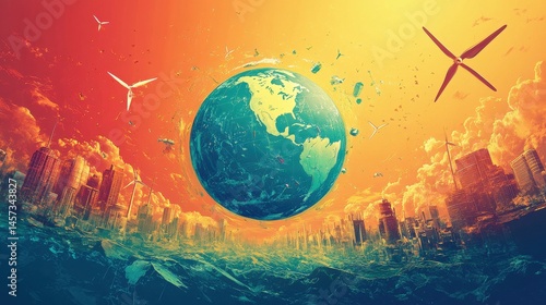 Naklejka premium An artistic world globe encircled by renewable energy vehicles, simplified...