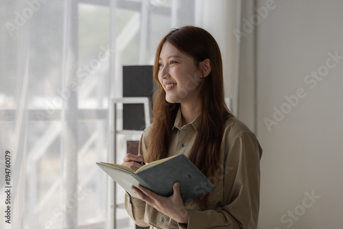 © Chadaporn, Fototapeta premium an Asian businesswoman is writing detail from the last meeting, there is a beautiful employee is smiling in the workplace, taking a note into the book witch is the first draft of report