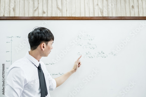 Fototapeta premium An Asian male teacher in a classroom near the whiteboard is writing and teaching a lesson with a special lecture in a class column. Math teacher explains arithmetic sums to university students