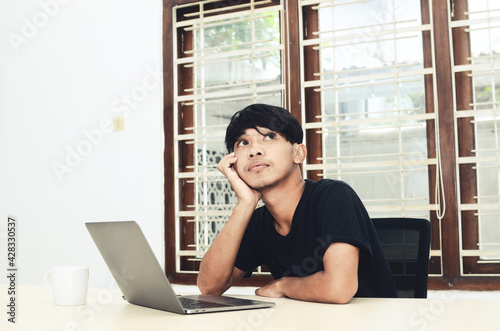 Obraz premium An Asian man is sitting in front of the laptop with a thoughtful expression