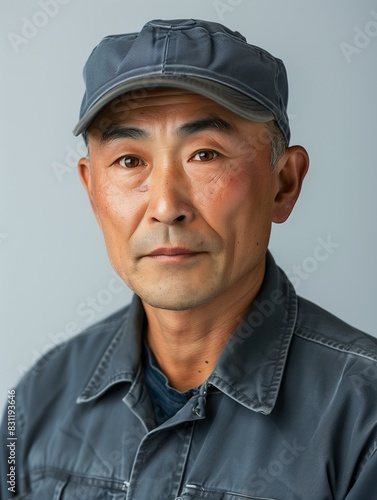 © Ailee Tian, Fototapeta premium An Asian middle-aged automotive assembly worker wearing a gray uniform.