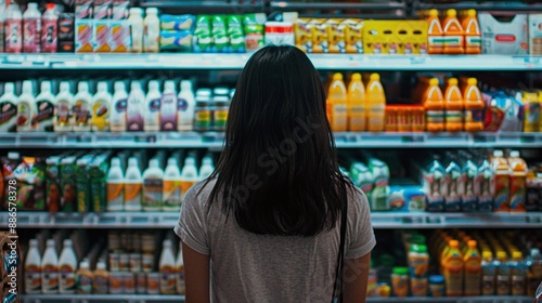 © Екатерина Чумаченко, Fototapeta premium An Asian woman is shopping in a wellstocked grocery store carefully making decisions on products and brands