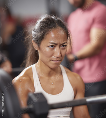 Obraz premium An Asian woman with a tense face performs a strength exercise with a barbell in the gym. Her body is drenched in sweat, her gaze is focused, demonstrating strength, determination .