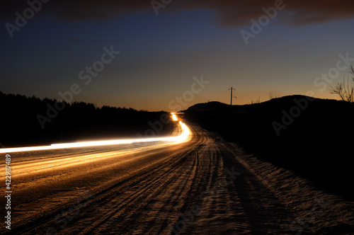 Fototapeta premium An asphalt road at dusk with the headlights of passing cars at a slow shutter...