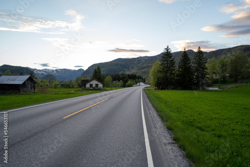 Naklejka premium an asphalt road in the norwegian mountains with green grass and trees along the edge