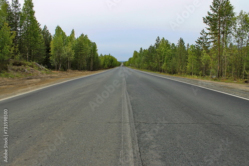 Fototapeta premium An asphalt road leading to the horizon through the forest. Republic of...
