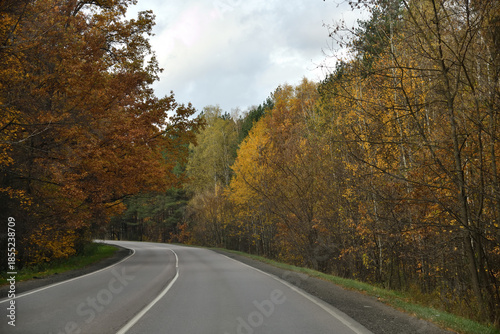 Obraz premium An asphalt road runs through an autumn forest on a cloudy day.