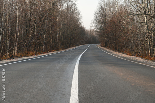 © Ramil Gibadullin, Fototapeta premium An asphalt way with markings through the morning autumn forest. Road trip concept