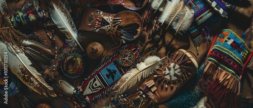 Fototapeta premium An assortment of traditional handmade crafts, including ornate feathers and beadwork, meticulously arranged to display cultural artistry and heritage.