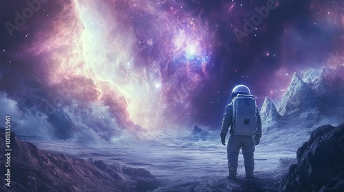 Fototapeta premium An astronaut explores the vastness of space, uncovering new galaxies and worlds. This journey feels like stepping through a magical portal to a distant universe.