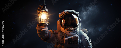 Fototapeta premium An astronaut exploring a dark lunar landscape while holding a glowing lantern...
