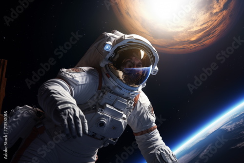 Naklejka premium An astronaut floating in space, with a view of Earth in the background....