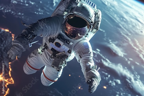 Fototapeta premium An astronaut floats weightlessly in the air above the Earth, performing a...