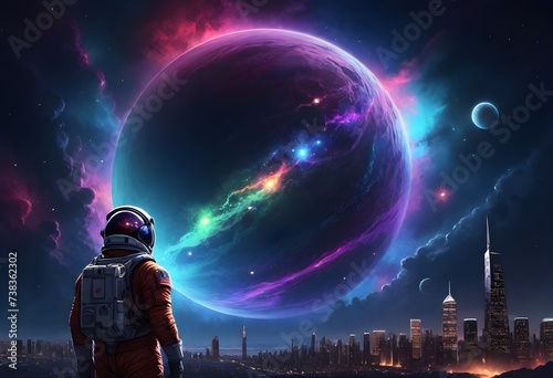 Fototapeta premium An astronaut in a white space suit standing in front of a futuristic city skyline at night, looking at a large vibrant planet rising in the background with a cosmic nebula