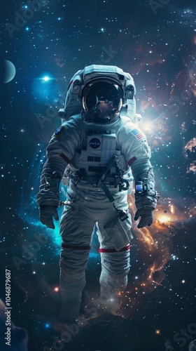 Fototapeta premium An astronaut in a white spacesuit floats in space amid nebulae and galaxies, symbolizing human curiosity and exploration. Planet-like objects surround,