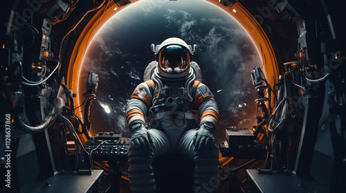 Naklejka premium an astronaut sitting in the circular window inside their spacecraft.