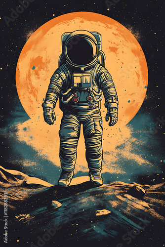 © Noufaldi, Fototapeta premium An astronaut stands on a lunar surface with a large, glowing moon in the background.