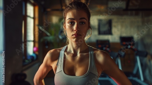 © Антон Сальников, Fototapeta premium An athletic woman uses a fitness streaming app for virtual training. Beautiful girl working out with her personal trainer.