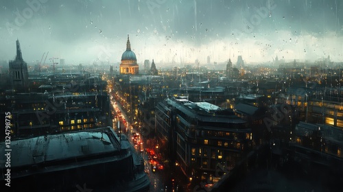 © Prism Trail, Obraz premium An atmospheric cityscape with buildings and a cloudy rainy sky