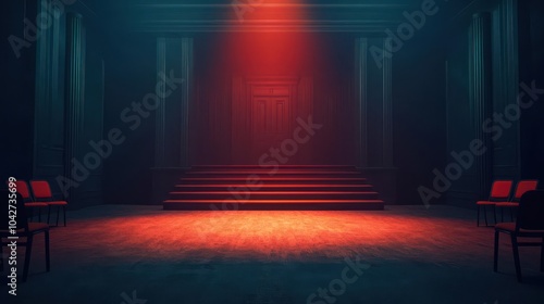Fototapeta premium An atmospheric interior scene featuring a dimly lit stage with red lighting,...