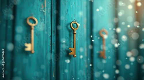 Fototapeta premium An atmospheric photograph of a mysterious doorway adorned with multiple antique keys, symbolizing the passage to unknown realms and secrets.
