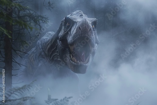 Obraz premium An atmospheric scene of a Tyrannosaurus Rex emerging from a foggy forest, its...