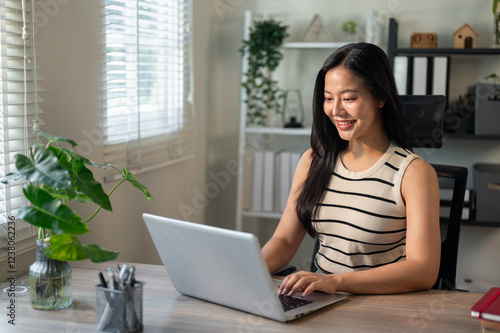 Naklejka premium An attractive Asian businesswoman is working on her laptop in her office,...