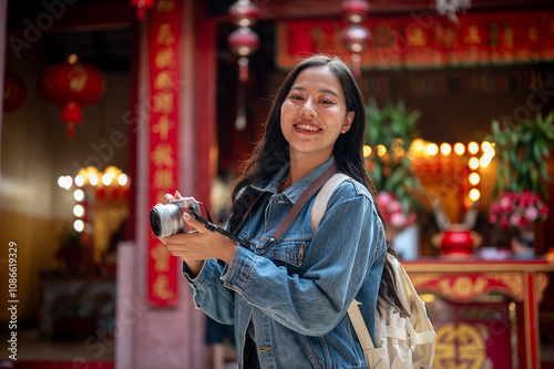 © bongkarn, Obraz premium An attractive Asian female tourist visits a stunning Chinese shrine, enjoying her solo travels.