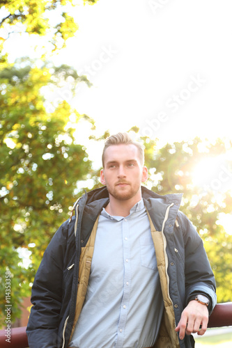 Obraz premium An attractive blonde man standing leaning outdoors on a sunny day with the sun right behind him, lens flare. Looking away from camera.