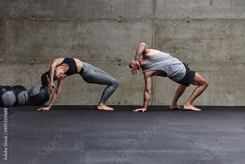 Fototapeta premium An attractive couple in the gym engaging in various stretching exercises together, showcasing their dedication to fitness, flexibility, and overall well-being. With synchronized movements, they
