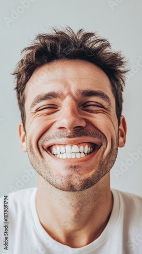 © Syahrul Zidane A, Obraz premium An attractive smiling man with his face distorted into the shape of a large, exaggerated smile.