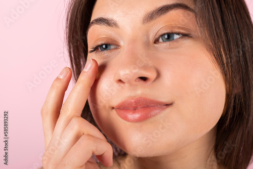 © Georgi, Fototapeta premium An attractive teenage girl wrapped only in a white towel is happily smiling and using a new face cream on her face. isolated on a pink background. Close-up.