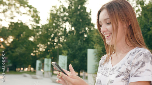 Fototapeta premium An attractive young lady using a phone in town while walking. Medium dolly shot. Soft focus