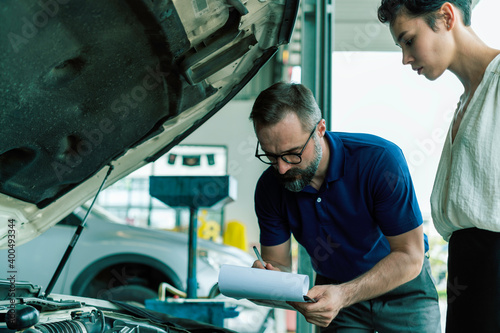 © Chatchawal, Fototapeta premium An auto mechanic talking to female customer in garage
