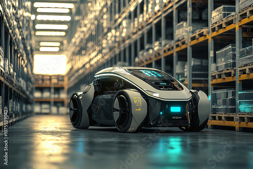 © Infinity Lens, Obraz premium an autonomous robotic vehicle navigating a warehouse, moving goods efficiently.