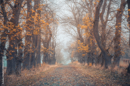 Obraz premium An autumn road with fog. Rotvoll in Trondheim, Norway