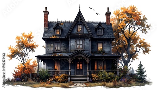 Fototapeta premium An autumnal, dark, and mysterious old home, framed by fall foliage, bathed in the soft light of twilight, stands sentinel against a white background.