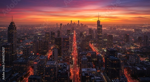 © Alvin, Obraz premium An awe-inspiring aerial view of a vibrant cityscape at sunset, bathed in the warm glow of an orange and purple sky, with illuminated streets and towering skyscrapers.