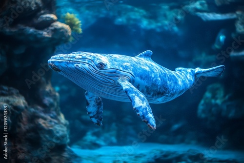 © ChaoticMind, Naklejka premium An awe-inspiring depiction of a blue whale swimming sleekly through the clear ocean, surrounded by coral reefs, capturing the tranquility and majesty of marine life.