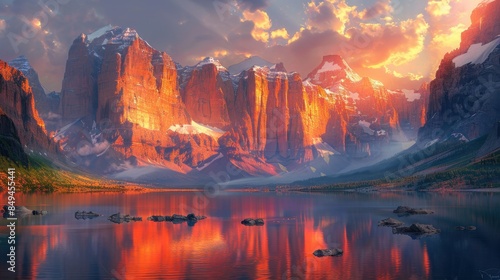 © MakoPoko, Fototapeta premium An awe-inspiring shot of towering mountains during sunrise, with the first rays of light illuminating the rugged cliffs and casting long shadows. The sky is painted in shades of orange and pink,