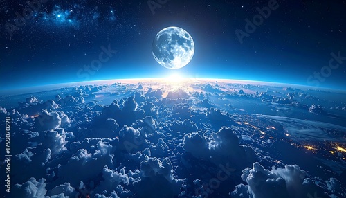Obraz premium An awe-inspiring view from space showcasing a luminous full moon rising over...