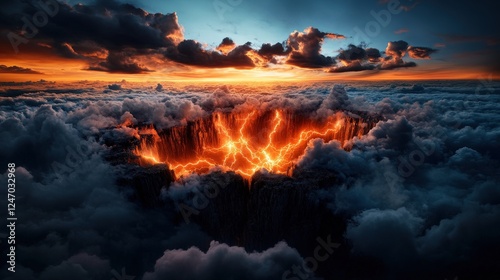 © DKPhoto, Fototapeta premium An awe-inspiring view of a large crater lit by striking lightning during sunset, surrounded by thick clouds and creating a powerful scene of nature's raw energy and majesty.