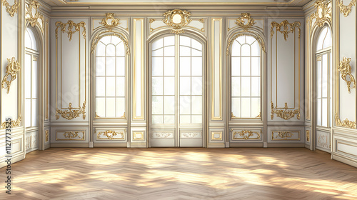 Fototapeta premium An century french rococo style salon with ornate white and gold paneling and parquet floors. Rococo. Illustration