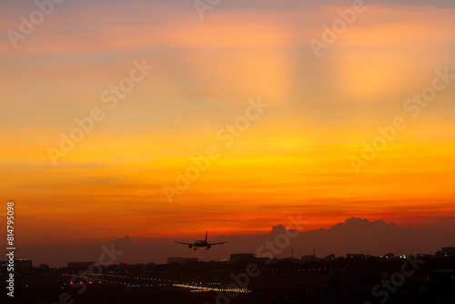 © Nguyen Duc Huy , Fototapeta premium An Commercial Airplane Landing At Sunset.