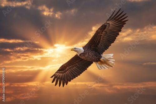 © Gwendolyn Davis, Fototapeta premium An eagle soars against a backdrop of golden sunset clouds