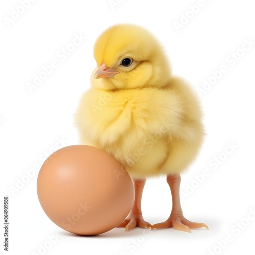 © Aaron, Fototapeta premium An easter fluffy yellow chick standing next to a brown egg with copy space
