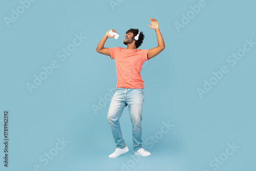 © Prostock-studio, Fototapeta premium An eastern millennial guy with curly hair sings and dances joyfully on a blue studio background. Using a mobile phone as a microphone, he seems to be in a lively moment, enjoying his music.