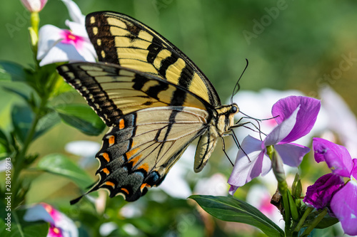 © James, Fototapeta premium An Eastern Tiger Swallowtail takes nectar from purple, magenta, pink, and white flowers in a summer garden
